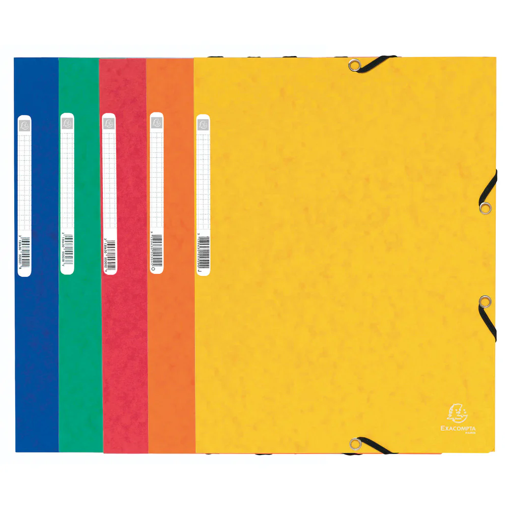 LOT DE 5 CHEMISES 3 RABATS À ÉLASTIQUE EN CARTON EXACOMPTA - MATIÈRE : Carton - EPAISSEUR MATIÈRE : 5/10E - GRAMMAGE MATIÈRE : 355 g/m2 - DIMENSION : 24x32 cm - FORMAT À CLASSER : A4 - CAPACITÉ (FEUILLETS 80GR.) : 150 - COULEUR : Couleurs assorties