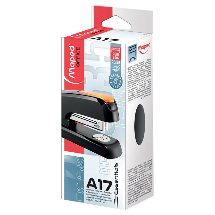 AGRAFEUSE DE BUREAU MAPED A17 - Capacité d'agrafage: 25 feuilles avec l'agrafe 24/6 ou 26/6 - Agrafeuse avec une capacité d'agrafage de 25 feuilles - Corps en plastique - Enclume réversible fonction agrafage, clouage et épinglage - La profondeur d'agrafage maximale pour le papier est de 57 mm