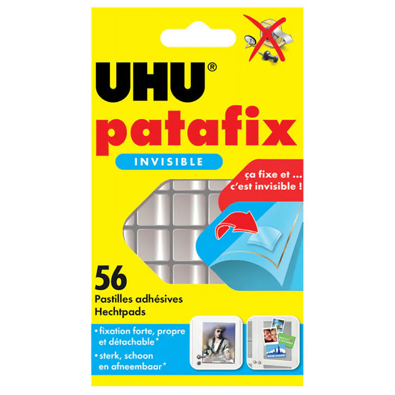 PATAFIX UHU TRANSPARENT - Fixation rapide et propre - 56 pastilles adhésives double face et invisibles - Transparentes - Invisibles sur le verre - Détachables de la plupart des supports lisses - Fixer rapidement et proprement de petits objets tels que des photos, des affiches, des cartes postales, idéales pour fixer du papier et des petits objets sur différents supports : murs, meubles, fenêtres, Verre, plastique et la porcelaine