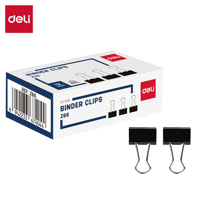 BINDER CLIP 15MM PAQUET DE 12 NOIR DELI - Ces clips métalliques sont parfaits pour classer les documents - Largeur 15 mm - Clips en acier à ressorts qui s'ouvrent facilement - Haute qualité et efficace - Poignée pliable pour faciliter le stockage - Couleurs : Noir