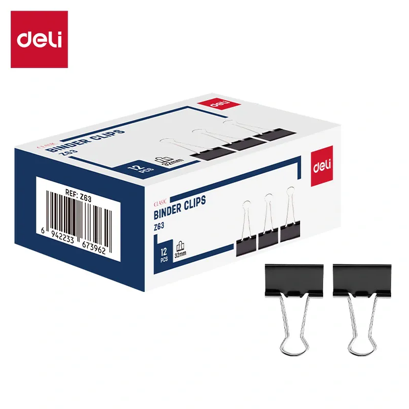 BINDER CLIP 32MM PAQUET DE 12 NOIR DELI - Ces clips métalliques sont parfaits pour classer les documents - Largeur 32 mm - Clips en acier à ressorts qui s'ouvrent facilement - Haute qualité et efficace - Poignée pliable pour faciliter le stockage - Couleurs : Noir