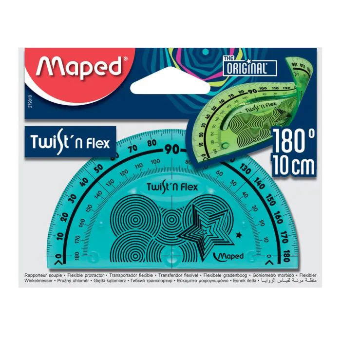 RAPPORTEUR MAPED TWIST'N FLEX 10 CM - Fabriquée en polystyrène non toxique - Graduation en mm - Longueur 10 cm - 100% résistant aux chocs : résiste à plier, tordre et chocs sans casser. - Couleur : Bleu Vert et rose