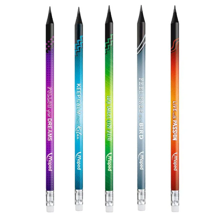CRAYON GRAPHITE MAPED BLACK'PEPS ENERGY AVEC GOMME - Dureté mine-crayon: HB - Crayons écologiques - Facile à tailler - Crayons graphite colorés avec messages positifs différents