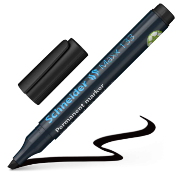 MARQUEUR PERMANENT SCHNEIDER 133 NOIR - Pointe biseautée - Largeur de trait: de 1.0 à 4.0 mm - Le corps est en plastique recyclé à 95%, le réservoir d'encre à l'intérieur en fibres recyclées à 75% - Type de Surface d'écriture: carton, papier, plastique, verre, métal, bois, et autres matériaux - Séchage rapide - Résistant á l'eau et à la lumière - Indélébile, Rechargeable avec le flacon d´encre Maxx 640 - Couleur : Noir .