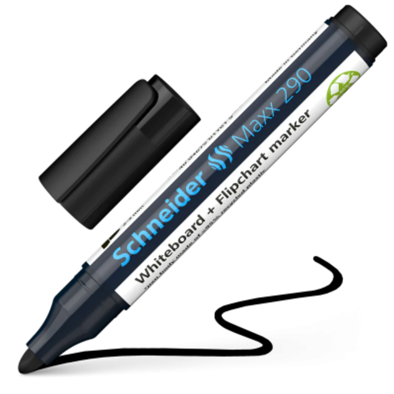 MARQUEUR POUR TABLEAU BLANC SCHNEIDER MAXX 290 NOIR - Idéal pour une utilisation sur tableaux blancs - Épaisseurs de trait : 2 à 3 mm - Effaçable à sec sans résidu - Visibilité supérieure, couleurs vives et séchage rapide - Encre cap-off, peut rester ouvert 2-3 jours - Rechargeable avec le flacon d'encre 665 - Couleur : Noir