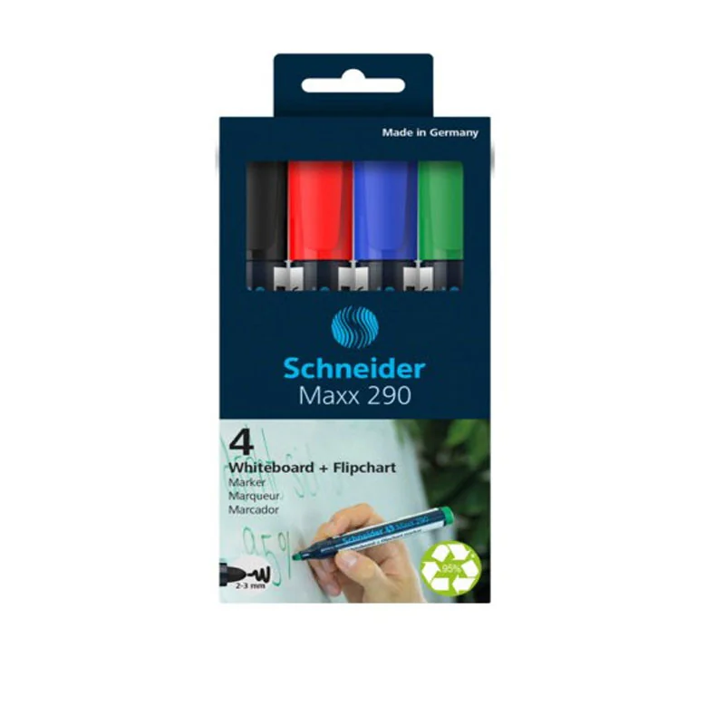 POCHETTE DE 4 MARQUEURS POUR TABLEAU BLANC SCHNEIDER MAXX 290 - Idéal pour une utilisation sur tableaux blancs - Épaisseurs de trait : 2 à 3 mm - Effaçable à sec sans résidu - Visibilité supérieure, couleurs vives et séchage rapide - Encre cap-off, peut rester ouvert 2-3 jours - Rechargeable avec le flacon d'encre 665 - Couleur : noir, rouge, vert et bleu