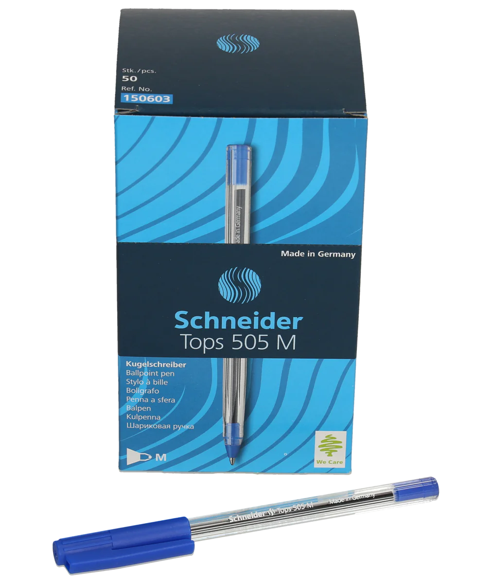 STYLO À BILLE SCHNEIDER TOPS 505 BLEU - Épaisseur de trait moyen (M) : 1,0 mm - Pointe en acier inoxydable résistante à l’usure - Corps transparent - Couleur: Bleu