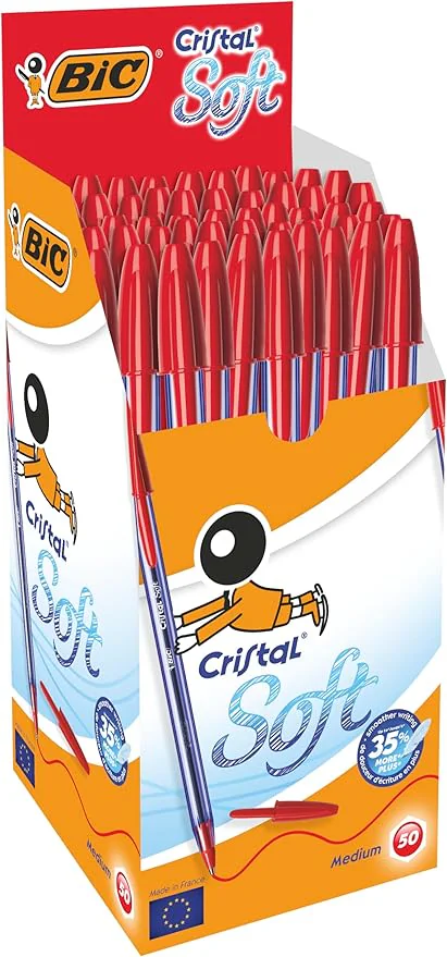 STYLO À BILLE BIC CRISTAL SOFT ROUGE - Largeur de trait: 1,2 mm - Forme hexagonale pour une meilleure prise - Encre de qualité, séchage rapide et écriture douce - Corps transparent - Corps translucide à la couleur de l'encre - Couleur : Rouge
