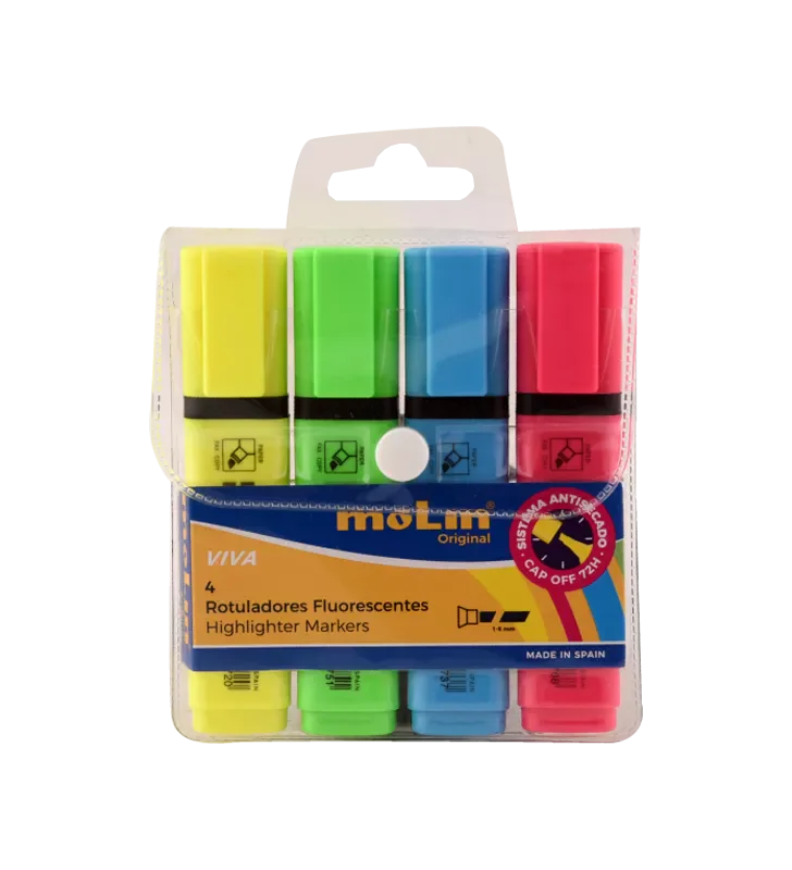 POCHETTE DE 4 SURLIGNEURS FLUO MOLIN ASSORTIS - Longueur de Pointe : de 1.0 à 5.0 mm - Type de papier: normal, Photocopie et Fax - Corps en PP est résistant à l'évaporation - Pointe biseautée - Luminosité maximale - Séchage rapide - N'altére pas les documents - Indélébile et ne s'efface pas - Couleur : ASSORTIS (Jaune,Bleu,Rose,Vert)